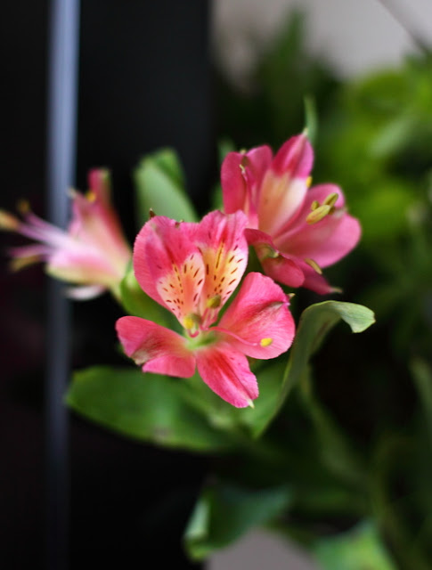 Han kom selv hjem med en kæmpe buket blomster til mig. Dog mente han, at det var, fordi han "skyldte" mig en fra min fødselsdag, hvor han gerne ville have haft købt en, men han var ikke ude og hente morgenmad til mig som før i tiden på min fødselsdag, da jeg er nødt til at spise havregryn for at kunne tåle resten af det, der spises den dag. Men den var rigtig fin, og jeg blev rigtig glad for den. Den står stadig pænt i dag, næsten en uge efter, og inkaliljerne er sprunget ud i den nu.